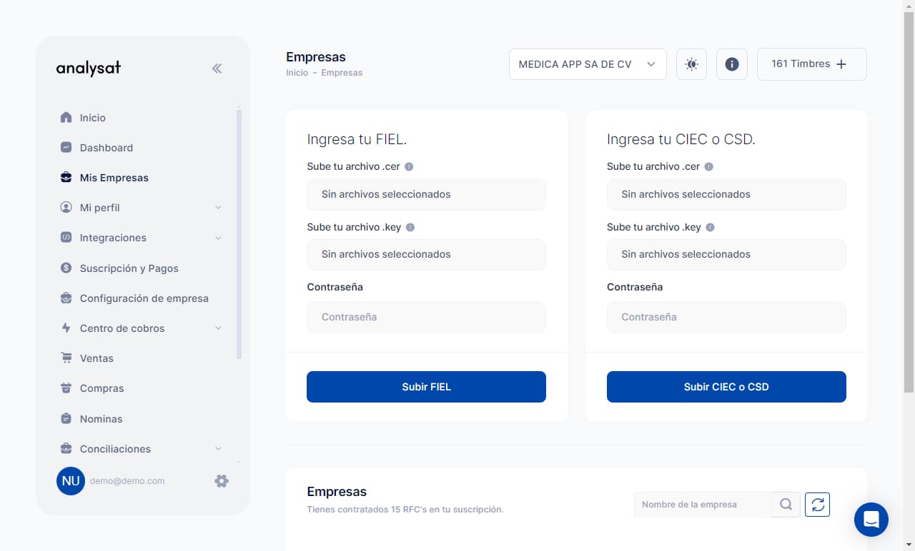 Ingresa tu EFIRMA y CSD para que Analysat comience a descargar automáticamente todas tus facturas de los últimos 5 años. Asegúrate de tener toda tu información fiscal siempre actualizada y accesible.